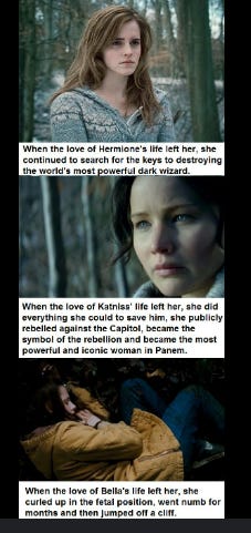 This is one of the situations that proved that Bella wasn’t as strong a protagonist as others. When Hermione Granger lost the love of her life, she continued to search for the Horcruxes and even saved her and Harry’s lives in Bathilda’s house. When Katniss Everdeen lost the love of her life, she used this to fuel herself as the Mockingjay in the rebellion against the Capitol. When Bella Swan lost the love of her life, she jumped off a cliff.