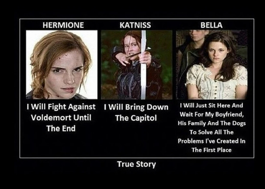Bella was often compared to other female character such as Hermione Granger and Katniss Everdeen. However, because the Twilight series is a vampire-romance, the characters would be a lot more obsessed with each other and their love would be the main point of the story. Since the romance element isn’t as prominent in Harry Potter, for example, the characters aren’t as obsessed with each other.